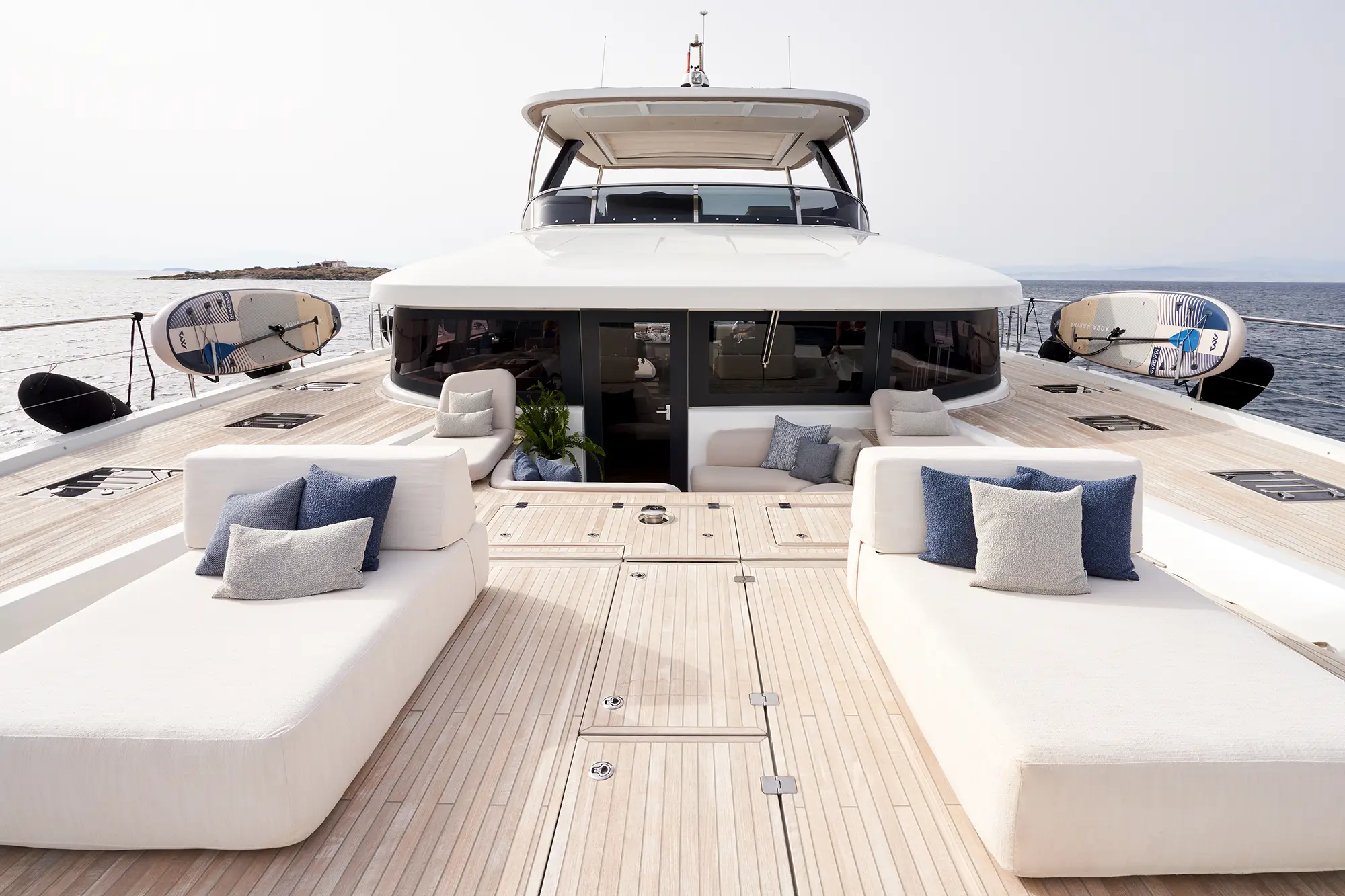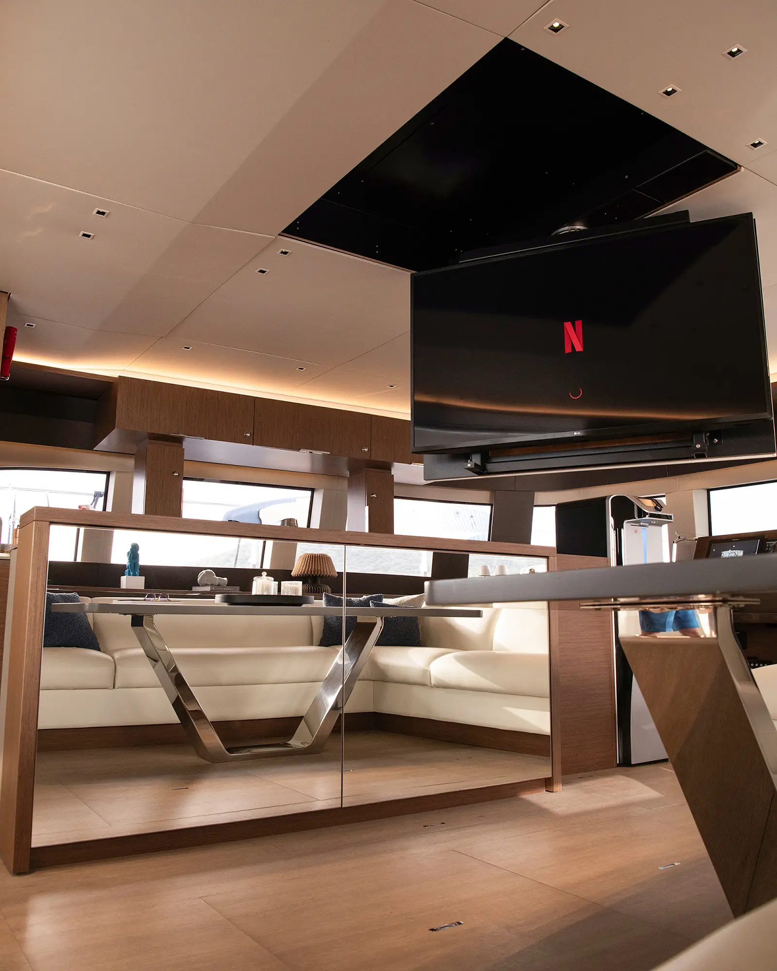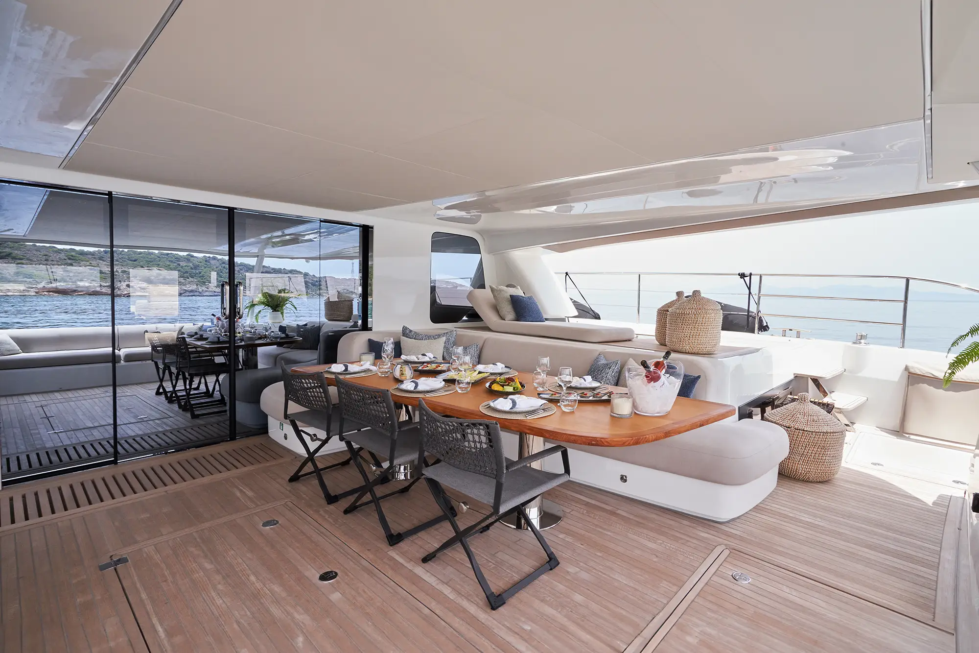 Vast flybridge featuring a spacious lounge area as well as an opening hard top