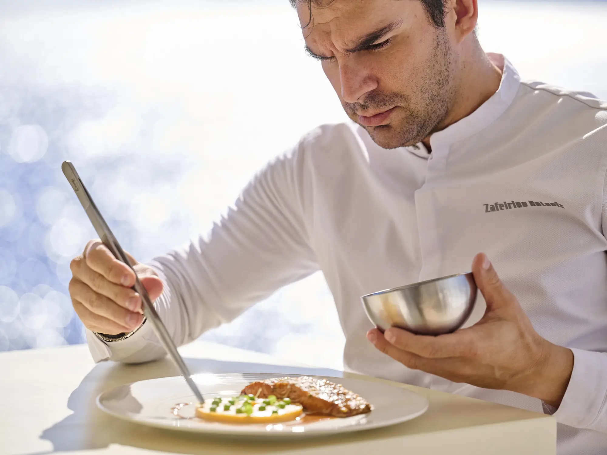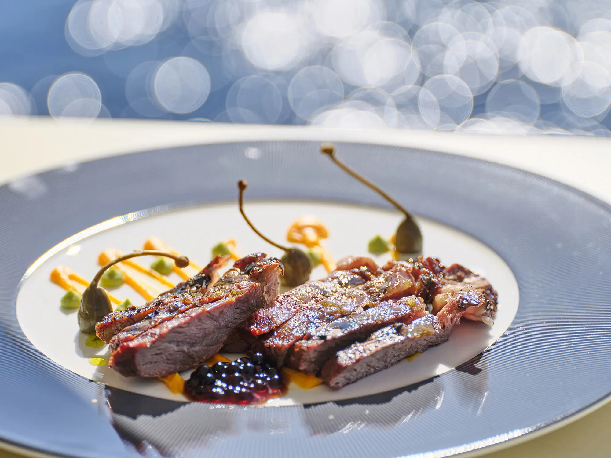 Modern, light interiors complemented by expansive floor-to-ceiling windows in the main salon