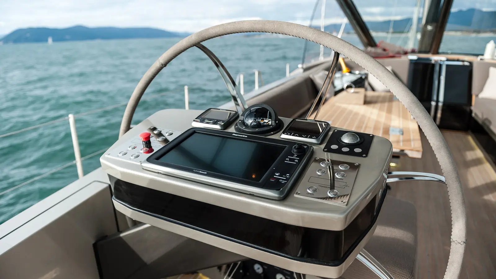 Her outdoor spaces, characterized by the large cockpit area, with two opposite facing sofa beds and two folding dining tables, create a welcoming and spacious lounge spot, sheltered by a hard-top and glass sprayhood, with a retractable roof top.