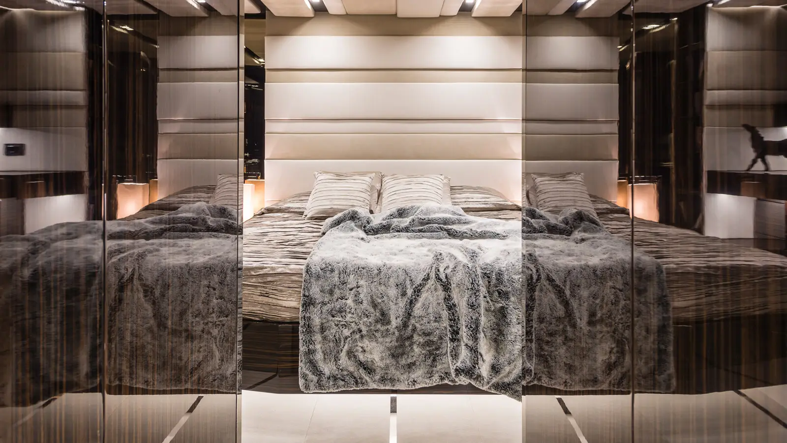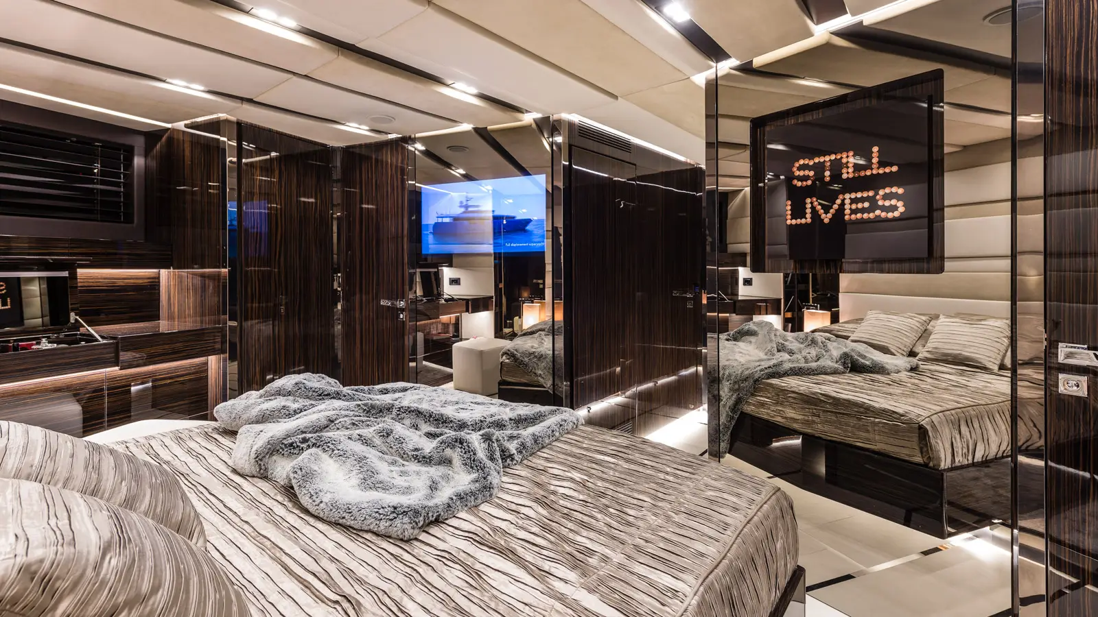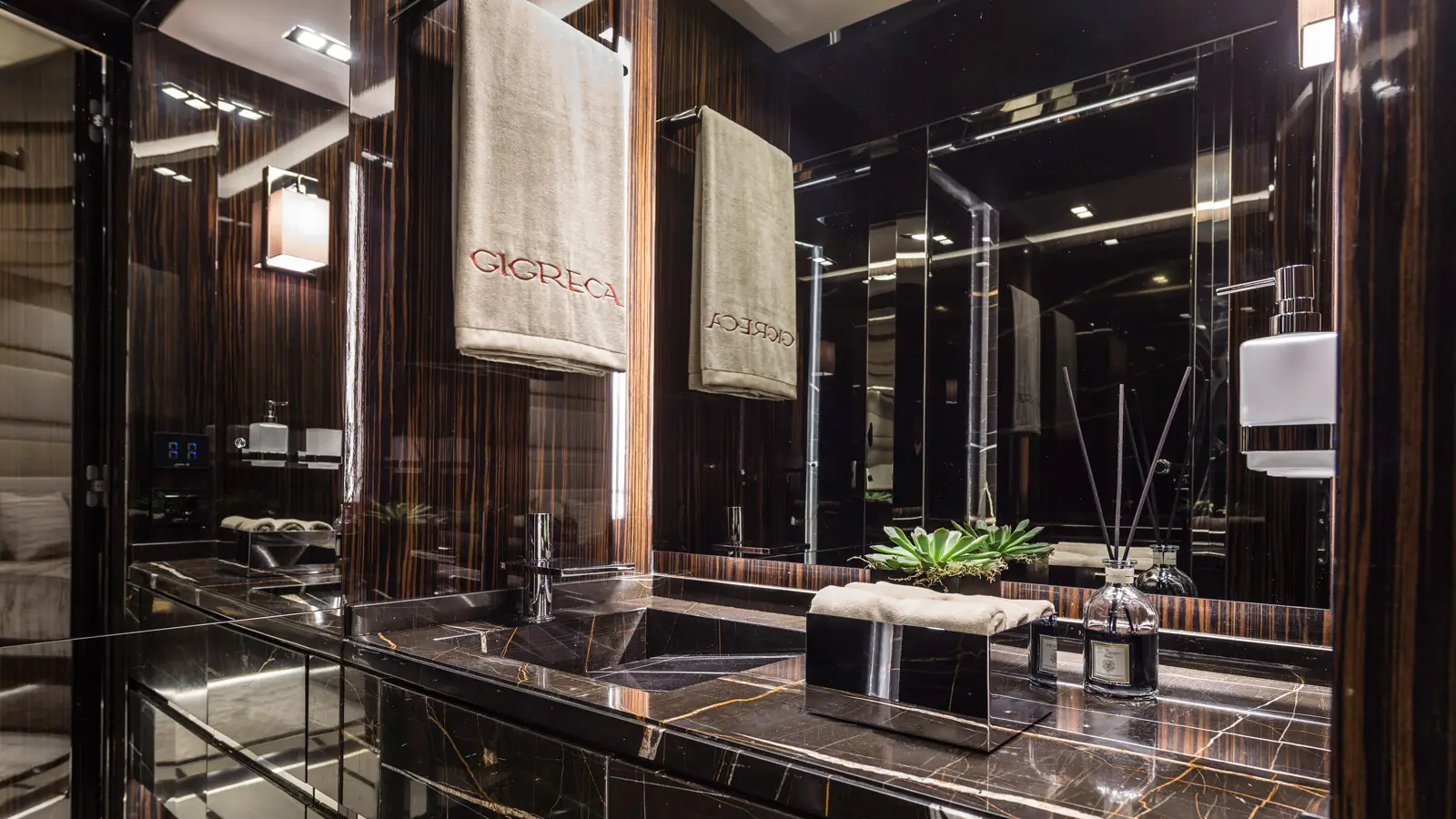 An elevated glass surrounded super-structure is where the indoor lounge is found, with an L-shaped sofa around a large dining table. The indoor is bright with perfect space for spending the early and late hours of the day, with a bar space, entertainment system, TV and proximity to galley area, all covered by high quality materials. Her 4 cabins, allow GIGRECA to host up to 8 guests comfortable, with a large Master suite located aft, a VIP double cabin is found forward the salon and 2 staterooms, a double and a twin with en-suite facilities, covered in marble.