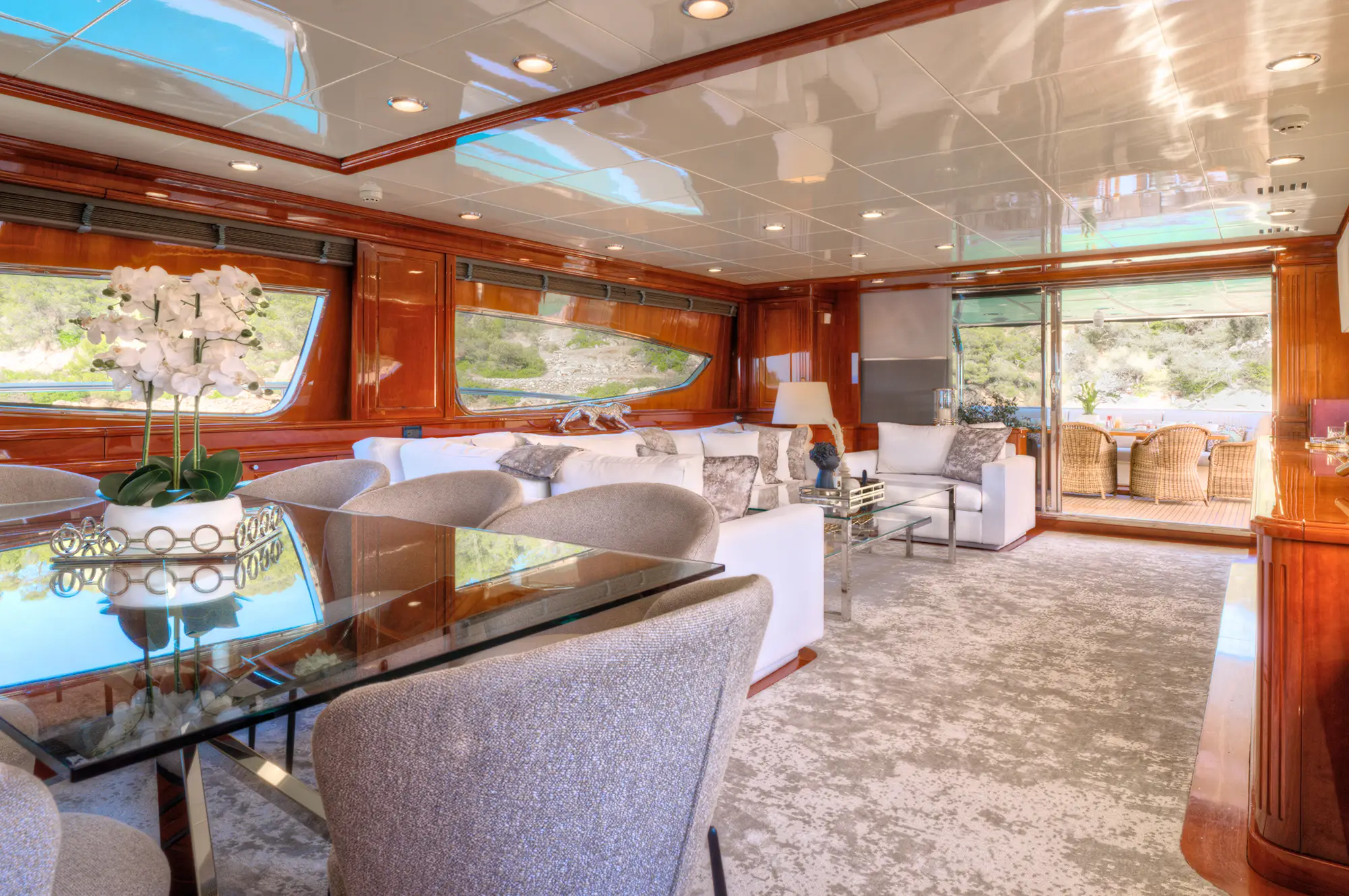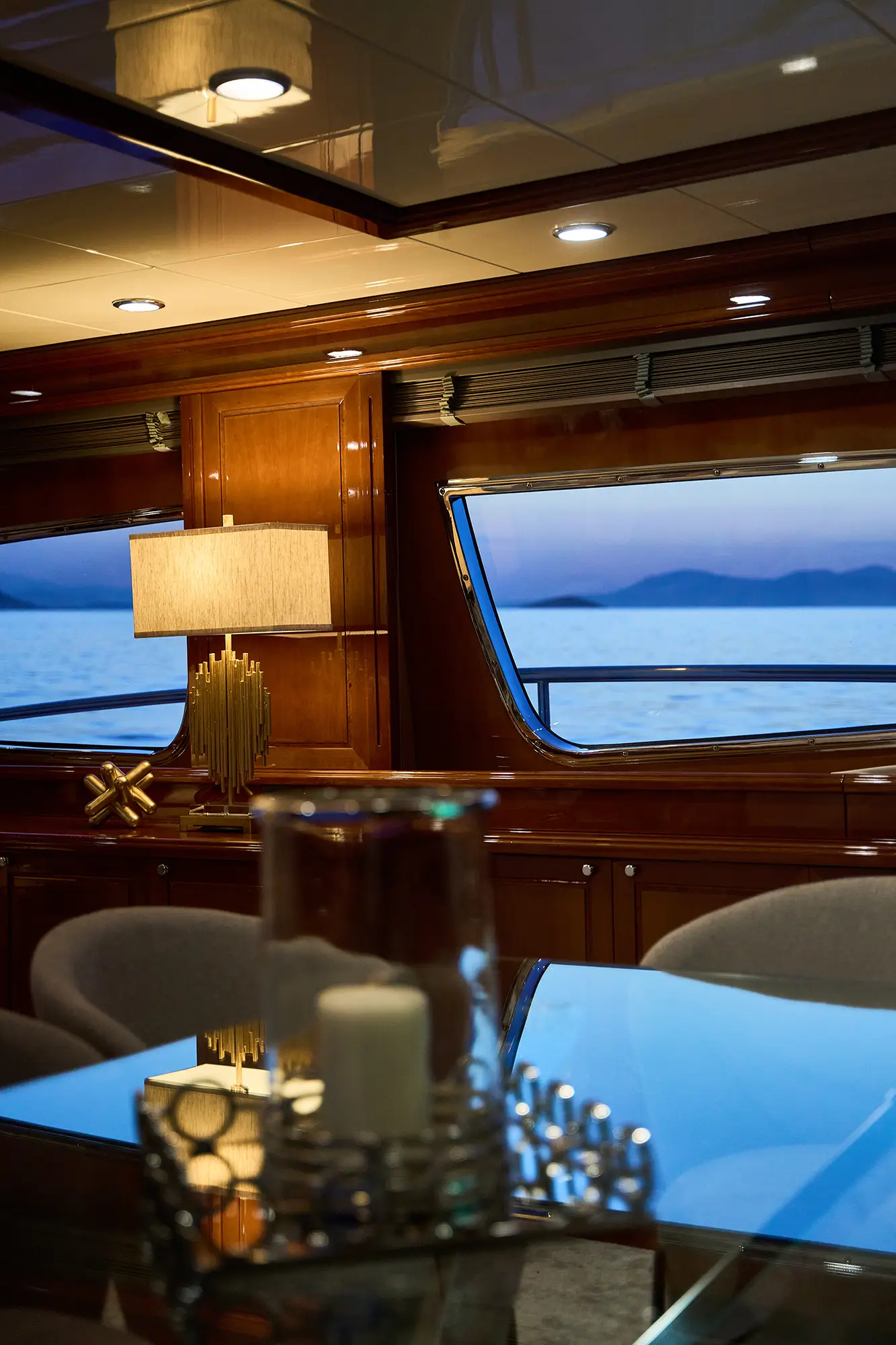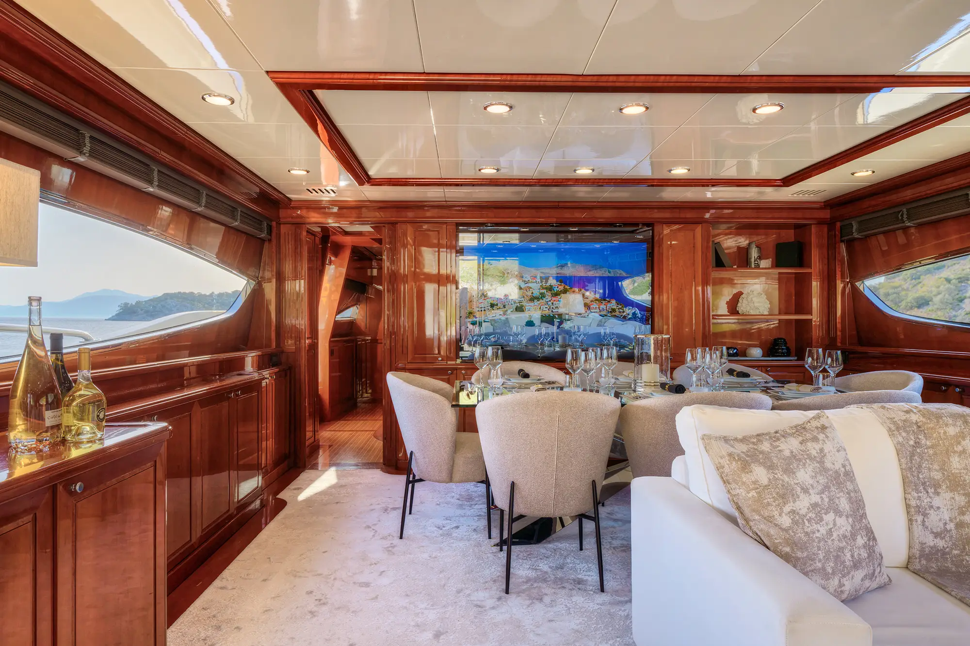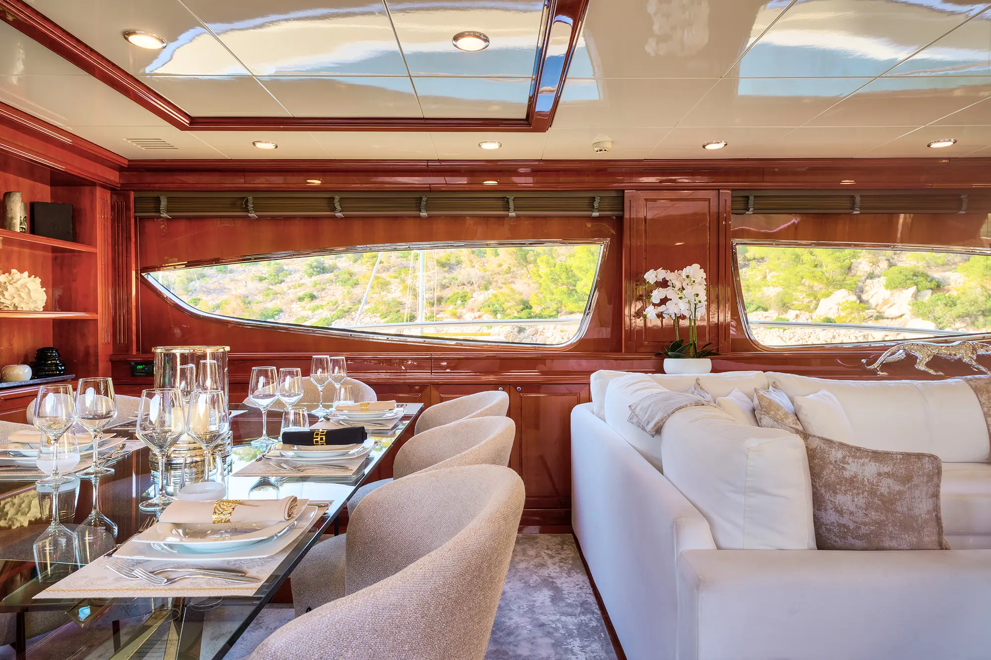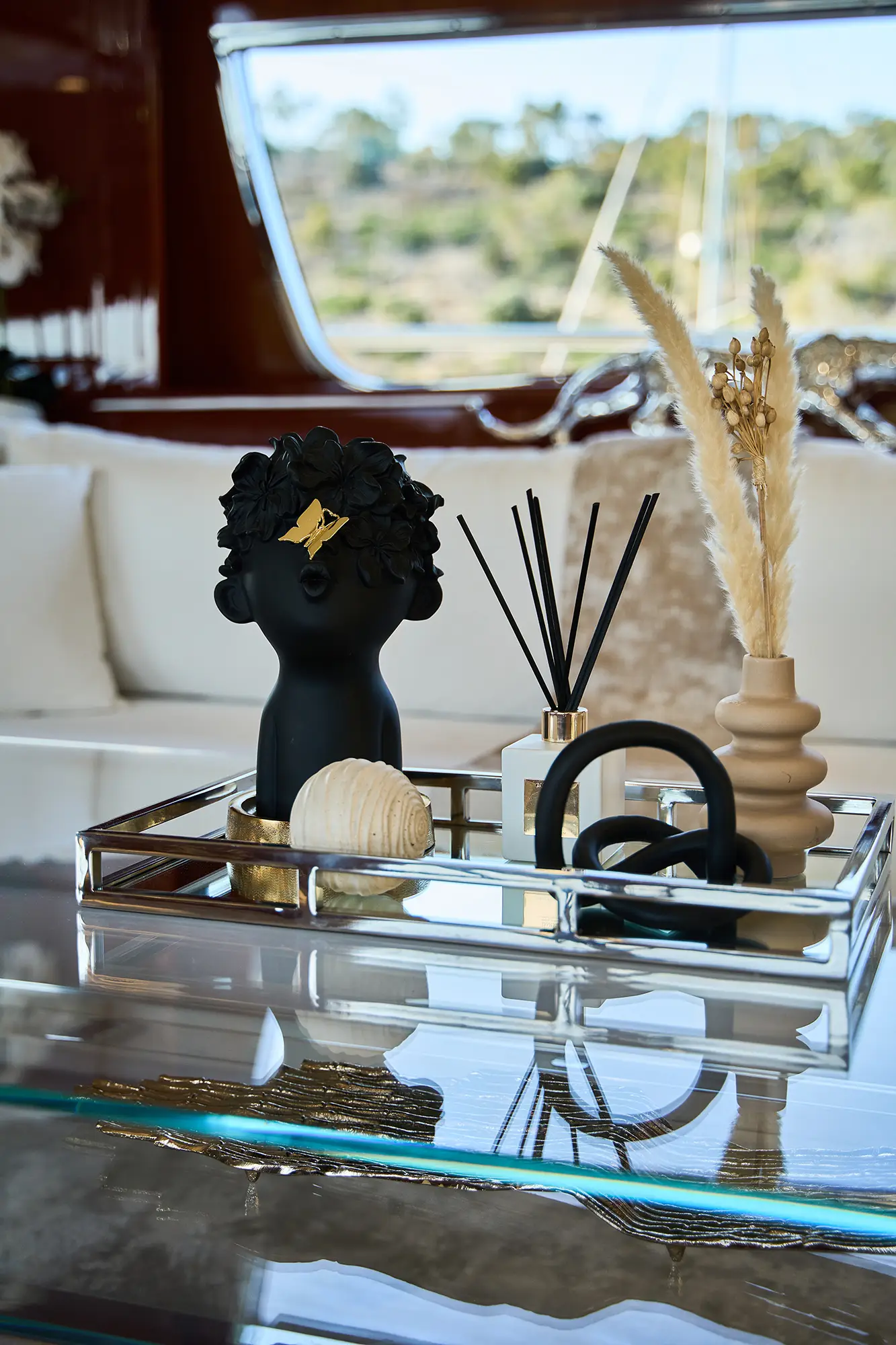 From the moment you step on board, DIVINE defines a refined cruising experience. Her interiors feature elegant silver accents, brand-new carpets throughout, and luxury amenities that elevate every detail of your stay. The main salon, enhanced with upgraded décor and a sleek modern dining table for 10, offers the perfect space to gather, unwind, and savor every moment.